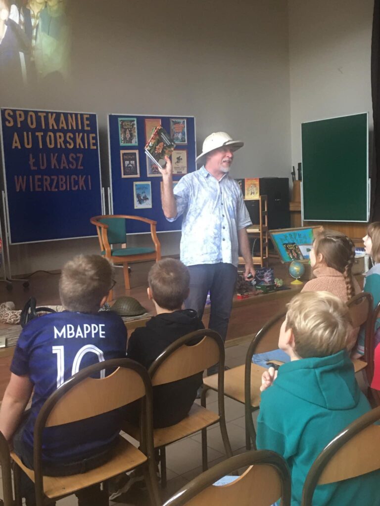 Dnia 14 listopada klasy trzecie brały udział w spotkaniu z pisarzem – Łukaszem Wierzbickim, autorem naszych lektur: „Dziadek i Niedźwiadek” oraz „Afryka Kazika”. Nasz gość opowiadał o swojej pracy, o tym, jak powstawały jego książki i o ich bohaterach.